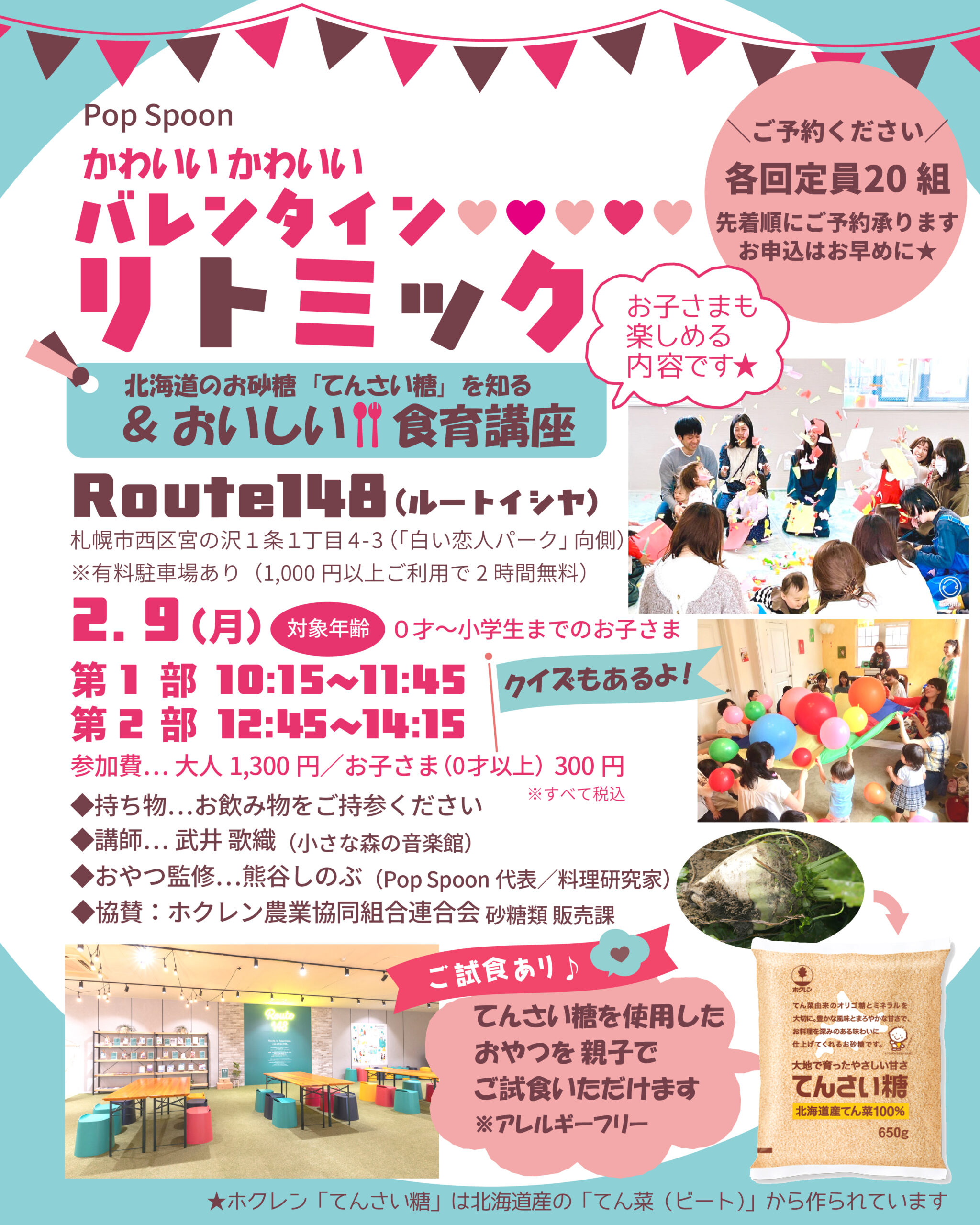 熊谷 しのぶ2026-01-17T10:17:19+09:00ママも子どもも一緒におんがくで思いっきり楽しめるリトミックです♪ 石屋製菓さんの夢いっぱいの広ーいカフェ Route148さんで開催です。 わかりやすくて楽しいてんさい糖教室(30分ほど)からはじまるよ♪ 当日はカフェ内は営業されているのでお飲み物や焼きたてiガトーやジェラートなども 是非お楽しみください♪ お子さんが自由に遊べるスペースも有り◎ おじいちゃんおばあちゃんも一緒に是非ご参加下さいね。 日時 2026年2月9日(月) 第1部 10:15~11:45 対象年齢 0歳から小学生までのお子様と親御様 第2部 12:45~14:15 対象年齢 0歳から小学生までのお子様と親御様 ※受付は、各回スタート時間の15分前からとなります。 場所 Route148 札幌市西区宮の沢1条1丁目4-3 地下鉄宮の沢駅徒歩2分 定員 各回 20組 お持ち物 お飲み物(途中水分補給をしましょう)・汚れても良い靴下でいらして下さい (やわらかい人工芝の上を靴下で歩きます) 講師 小さな森の音楽館 武井 歌織先生 企画 Pop Spoon 協賛 ホクレン農業協同組合連合会 砂糖類 販売課 参加費 大人1,300円(わかりやすいてんさい糖教室・リトミック・お土産付き) お子様3歳未満300円 (すべて税込) 駐車場あり (店内で1,000円以上お買い上げで2時間無料) 店内には飲食の他に、絵本やカードゲーム、お土産にぴったりな商品もあります♪ ゆっくり見ていかれてくださいね。 ◎ご予約時のお願い 先着順のお申し込みとなりますが、ご友人様同士一緒にお申し込みご希望の方は 必ず備考欄にご記入下さいませ。 お申し込みをし、3日経ってもPopSpoonからご連絡がなかった場合には 必ずお問い合わせをお願いいたします(ドメイン指定をされている方は、info@pop-spoon.comからの メールを受け取れるようにしていただきたく思います) キャンセルポリシー なにかございましたら、2/7の正午までに、必ずご連絡をお願いいたします。 それ以降は100%費用がかかります、ご理解の程よろしくお願いいたします。 (別の方に権利をお譲りいただければ もちろんお料金はかかりません) 参加申し込みフォームはこちら