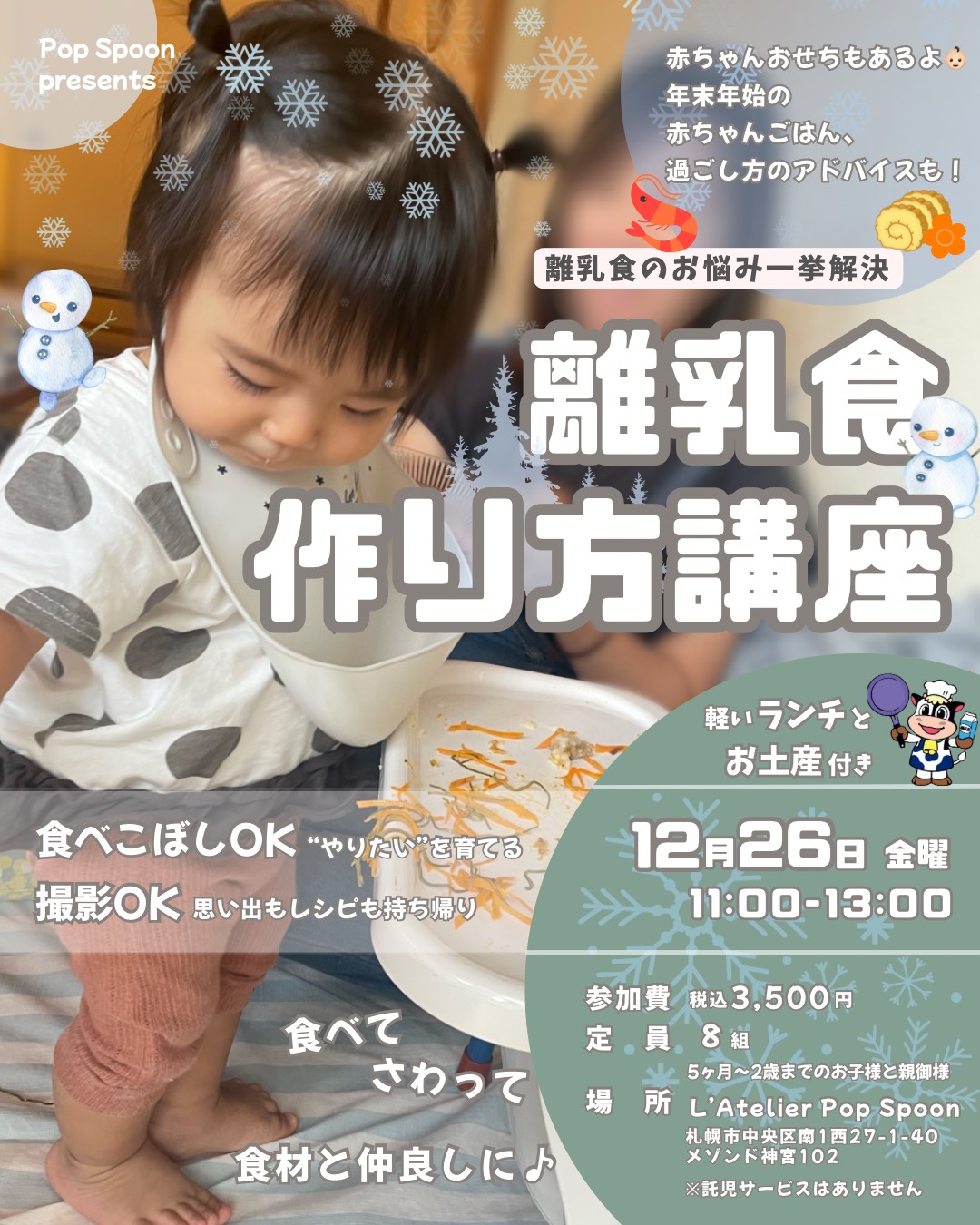 熊谷 しのぶ2025-11-07T09:20:02+09:00妊娠中の親御様と0歳から2歳までのお子様と親御様 しっかり離乳食の作り方を覚えませんか? 赤ちゃんおせち沢山でてきますよ♪ そして年末年始の気を付けるべきポイントもお伝えします。 当日デモンストレーションは動画も静止画も撮影OK 日時 2025年12月26日(金) 11:00~13:00 参加費 親子1組3,500円(税込)(離乳食作り方講座・親子で試食できる離乳食・お茶・テキスト・ランチ・お土産) 大人1名追加 1,500円(税込)※是非お父様や祖父母の方も覚えていただきたいので大歓迎です。 スペースと安全上の関係で、一家族お子様お一人でよろしくお願いいたします。 現金のみのお支払いをお願いしております。 講師 PopSpoon代表 マタニティフードアドバイザー/栄養士 熊谷 しのぶ 対象 妊娠中の方・0歳から2歳までのお子様と親御様 ご協賛企業様 #北海道牛乳普及協会 場所 PopSpoonアトリエ 札幌市中央区南1条西27丁目1-40 メゾンド神宮102 駐車場はございません(近隣の商業スペースは、2,000円以上お買い物をされると3時間無料になるようです) ◎ご予約時のお願い 先着順のお申し込みとなりますが、ご友人様同士一緒にお申し込みご希望の方は 必ず備考欄にご記入下さいませ。 ご予約に必ずアレルギーの有無(親御様かお子様か)をご記入ください。 お申し込みをし、3日経ってもPopSpoonからご連絡がなかった場合には 必ずお問い合わせをお願いいたします(ドメイン指定をされている方は、info@pop-spoon.comからの メールを受け取れるようにしていただきたく思います) キャンセルポリシー なにかございましたら、12/24の正午までに、必ずご連絡をお願いいたします。 それ以降は100%費用がかかります、フードロスを避けるためにも、ご理解の程よろしくお願いいたします。 万が一キャンセルになられましても、ご試食いただく予定のお料理、離乳食、レシピ、お土産は お渡しさせていただきます。(※当日取りにお越しいただける場合) 参加申し込みフォームはこちら
