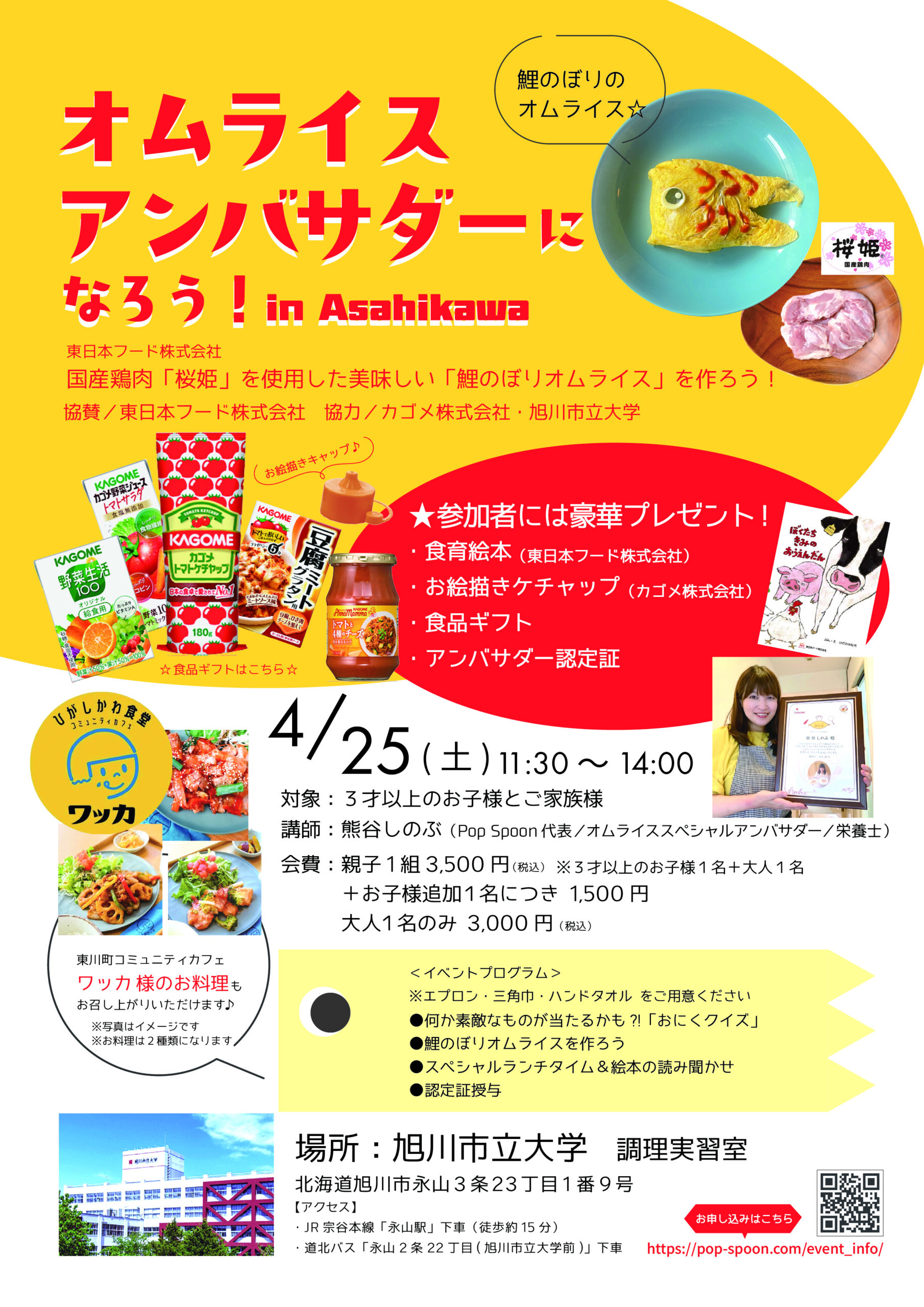 熊谷 しのぶ2026-04-08T18:14:55+09:00これまで 北海道中の親子さん 約300名にアンバサダー認定をしてまいりました。 ついに熊谷 母校での開催です。こちらの学校に社会人入学をし、栄養士として スタートを切れた 本当に大好きな学校、そして恩師がいらっしゃいます。 その恩師である豊島琴恵教授がなさっている 東川町のコミュニティカフェ ワッカ様の お料理も当日は副菜として2品お召し上がりいただけますよ★ 鯉のぼり🎏オムライスを作り、アンバサダー認定書を受け取り、 スペシャルランチを食べましょう♪ 日時 2026年4月25日(土) 11:30~14:00 場所 旭川市立大学 1階 調理実習室 旭川市永山3条23丁目1番9号 講師 オムライススペシャルアンバサダー/栄養士 熊谷 しのぶ 参加費 親子3,500円 お子様1名追加 1,500円 大人1名様でのご参加も大歓迎! お1人3,000円 内容 デモンストレーション・鯉のぼりオムライスの調理・ワッカの副菜2種・食育絵本・認定証・食品ギフト 対象 3歳以上のお子様とその親御様 お持ち物 エプロン・三角巾・ハンドタオル お申し込みの際に、参加者全員のアレルギーの有無をご記入願います。 お申し込みをし、3日経ってもPopSpoonからご連絡がなかった場合には 必ずお問い合わせをお願いいたします(ドメイン指定をされている方は、info@pop-spoon.comからの メールを受け取れるようにしていただきたく思います) キャンセルポリシー なにかございましたら、4/23の正午までに、必ずご連絡をお願いいたします。 それ以降は100%費用がかかります、ご理解の程よろしくお願いいたします。 参加申し込みフォームはこちら