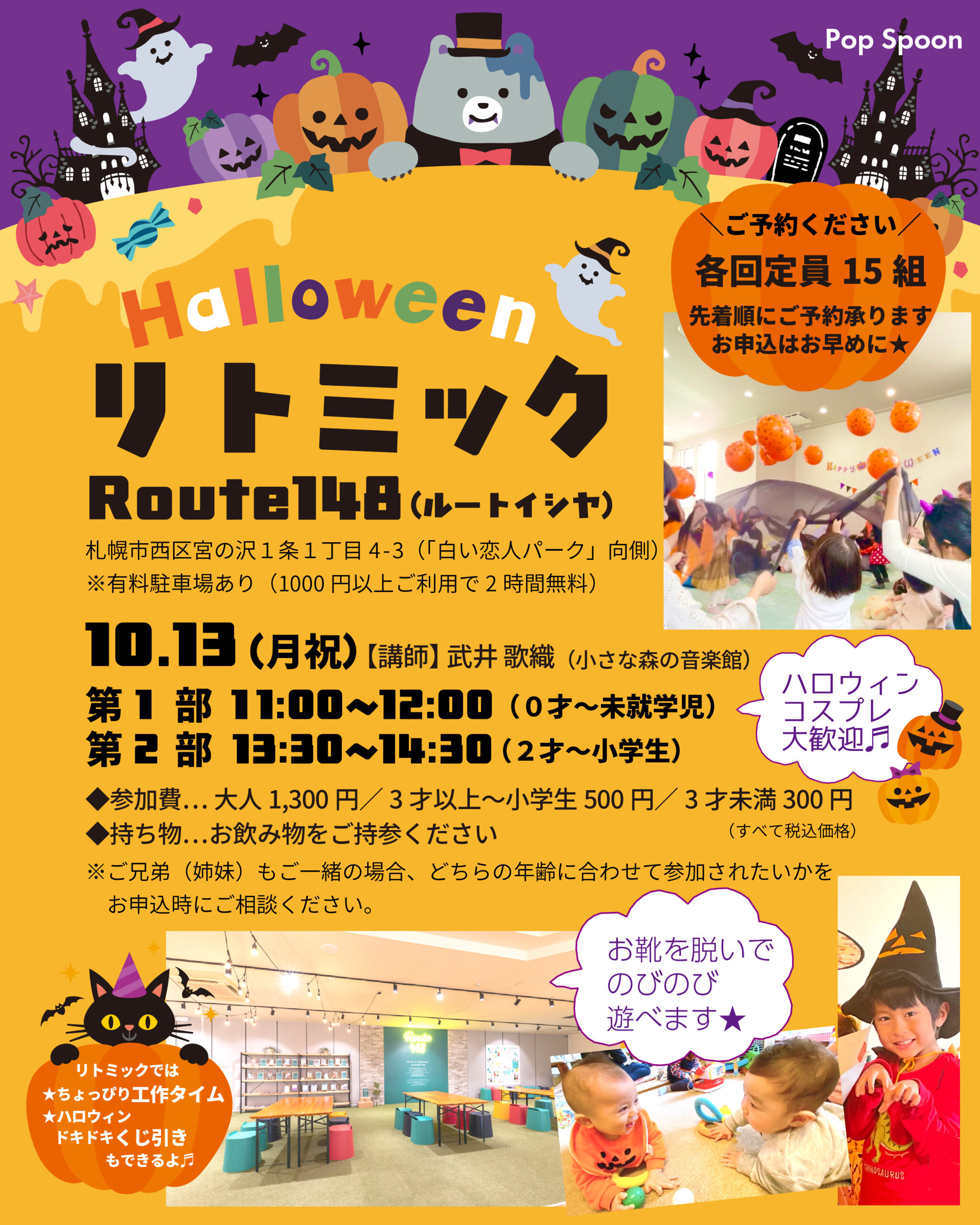 参加費 大人1,300円(リトミック・工作&ハロウィンくじ参加券・お土産付き)